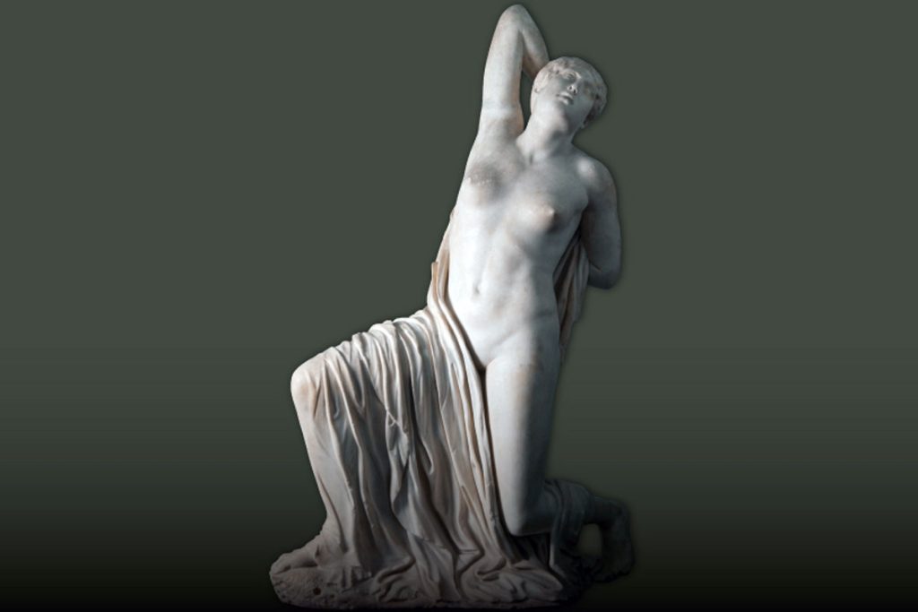 La scena fa riferimento al mito dei Niobidi. Questa scultura greca classica rappresenta la scena della figlia di Niobe, nel momento in cui viene ferita a morte dalla punizione divina di Apollo o Artemide. Inarcando la schiena, cerca istintivamente di rimuovere la freccia conficcata tra le spalle, ma crolla in una posa controllata ma dinamica. Nonostante il soggetto tragico, l’espressione rimane contenuta, riflettendo l’ideale classico della moderazione emotiva. La statua trasforma la violenza mitologica in un’immagine di compostezza, bellezza e vulnerabilità umana. Statua di Niobide ferita. Roma, presso il ninfeo degli Horti Sallustiani Marmo pario lichnite | 430 a.C. circa Roma, Museo Nazionale Romano, Palazzo Massimo